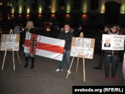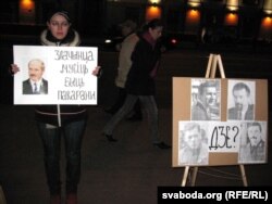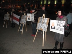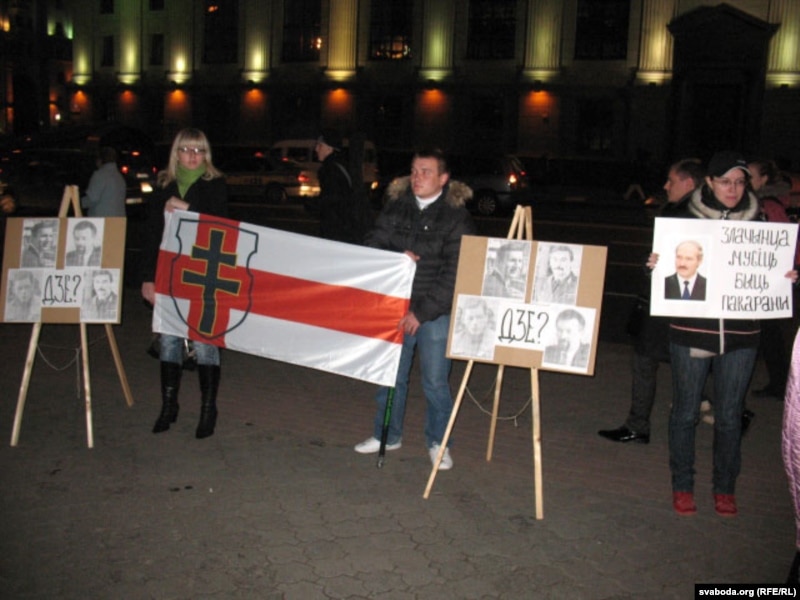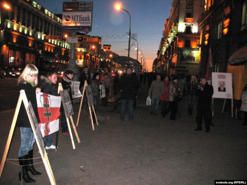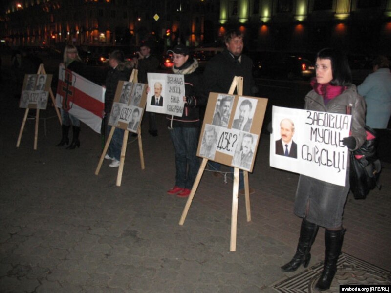 Насупраць пікету па зборы подпісаў за Аляксандра Лукашэнку некалькі актывістаў дасталі плякаты з партрэтамі А.Лукашэнкі і надпісамі: "Злачынца мусіць быць пакараны", "Забойца мусіць сысьці". На іншых плякатах былі партрэты зьніклых апанэнтаў дзейнай улады – Юрыя Захаранкі, Віктара Ганчара, Антоля Красоўскага і Зьміцера Завадзкага з пытаньнем: "Дзе?"
