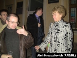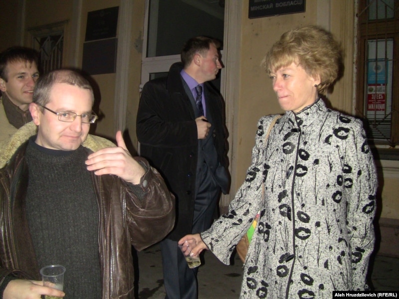 Міхась Башура і Тамара Сідарэнка ля будынку суду адразу пасьля вызваленьня.