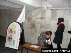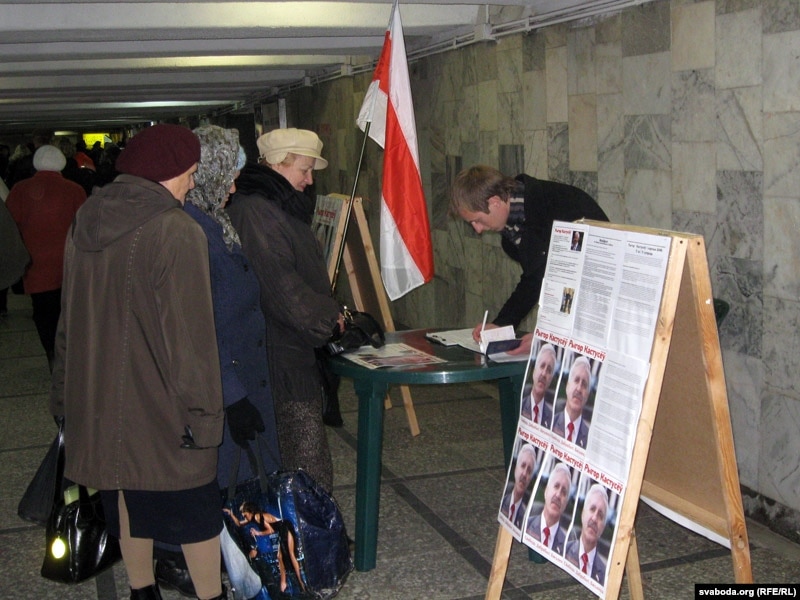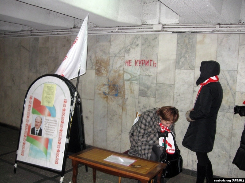 У падземным пераходзе паміж плошчай Якуба Коласа ў Менску і Камароўскім рынкам пашыхтаваліся адразу некалькі пікетаў. Самы буйны (чатыры зьбіральнікі подпісаў) — за дзейнага кіраўніка краіны. Прамаўляюць неахвотна і толькі пасьля праверкі дакумэнтаў: