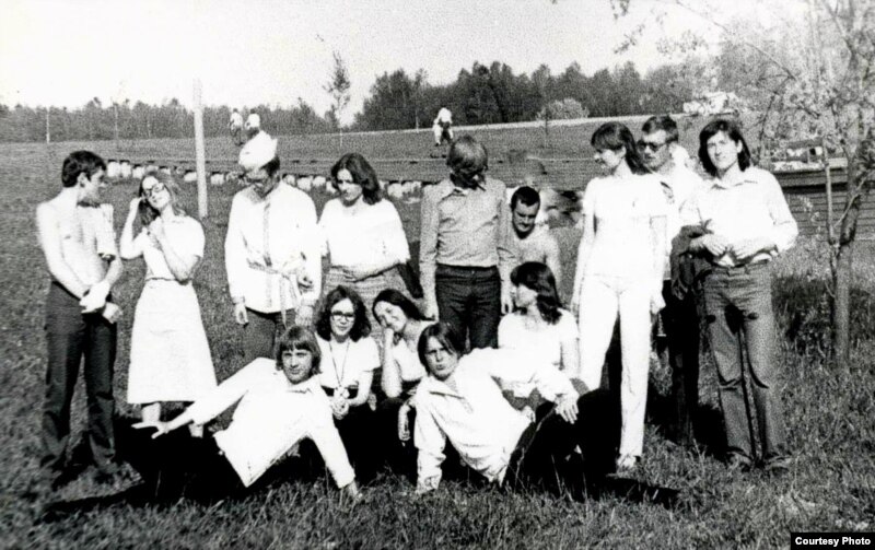 Майстроўня, 1981 год. Стаяць: Ігар Запрудзкі, Ларыса Сімаковіч, Вінцук і Арына Вячоркі, Гэнік Лойка, Сяргей Запрудзкі, Галя Кунцэвіч, аўтар, Сяргей Кныш. Сядзяць: Яўген Валасевіч, Наталля Лазоўская, Алена Амельчыц (Анісім), Янка Медзьвядзёў, Ірына Крук (Марачкіна).