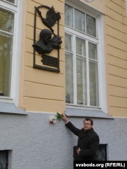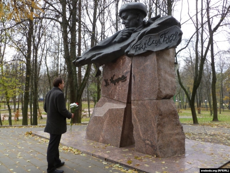 Алесь Міхалевіч каля помніка Караткевічу.