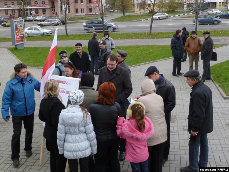 Напачатку побач разьмясьціўся і пікет па зборы подпісаў за вылучэньне Аляксандра Лукашэнкі, але неўзабаве зьнік. Наведнікі гандлёвага цэнтру пэрыядычна падыходзілі да групы Алеся Міхалевіча, адны адразу ставілі подпісы, іншыя задавалі пытаньні наконт праграмы кандыдата, цікавіліся, якія пераўтварэньні ў Беларусі ён прапануе.