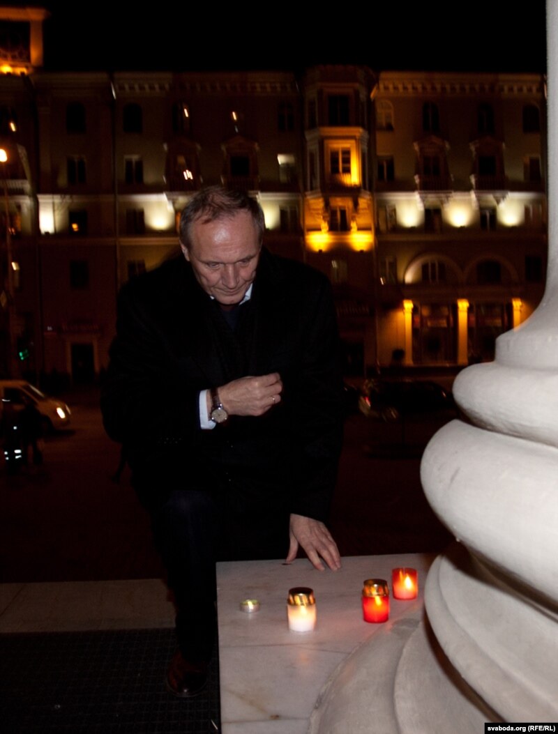Пасьля завяршэньня акцыі частка ўдзельнікаў падышла да будынку КДБ і паставіла сьвечкі на ганку каля калёнаў.