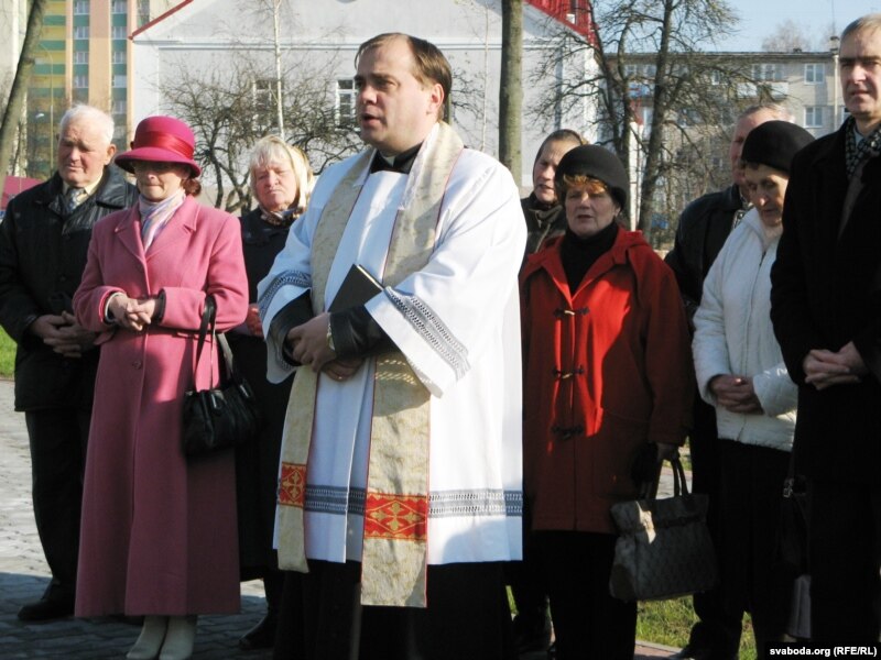 "Актывістам Таварыства беларускай мовы, а таксама Таварыству польскай культуры Лідчыны ўдалося дамагчыся ад мясцовай улады, каб чыноўнікі дазволілі ўшанаваць памяць пра ксяндза на месцы яго расстрэлу. Напярэдадні быў усталяваны камень, на якім зроблены надпіс па-беларуску і па-польску. І вось толькі што гэты помнік асьвяціў пробашч лідзкага Фарнага касьцёла Ўладзімер Гуляй. Жыхары Ліды, якіх тут сабралася больш за 30 чалавек, прачыталі малітву. Пасьля гэта да сабраных зьвярнуліся кіраўнік Таварыства польскай культуры Аляксандар Колышка, і прадстаўнік ТБМ Станіслаў Суднік".