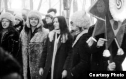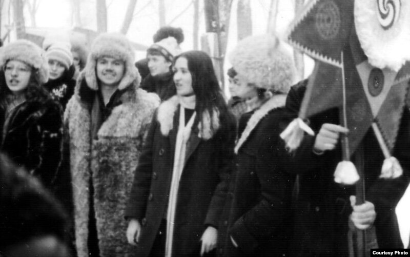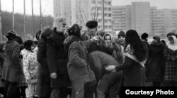 Майстроўцы ўзнаўляюць народныя гульні падчас Гуканьня вясны. Менск, Зялёны луг, 1981 год. Анатоль у белай шапцы.