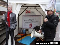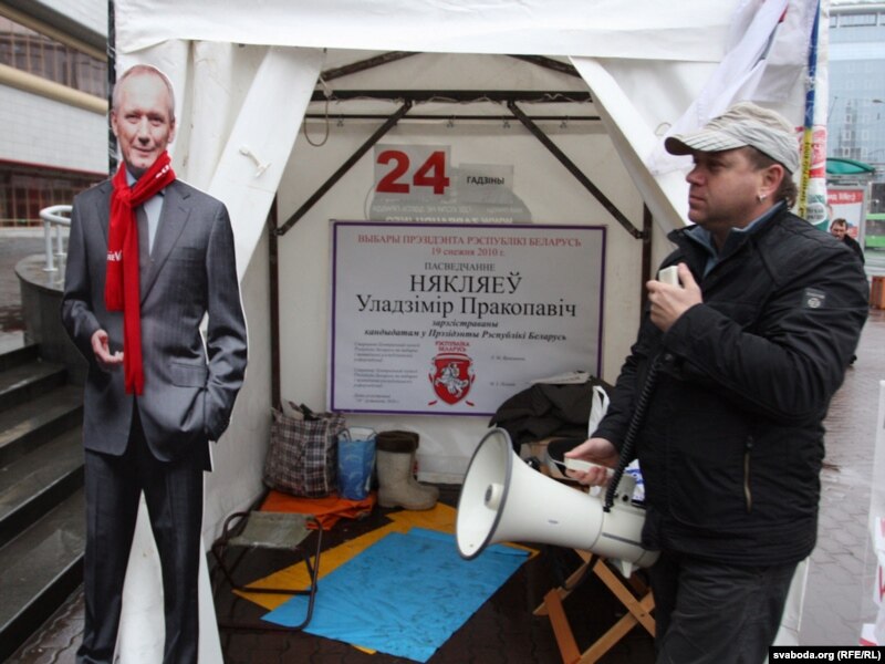На прывакзальнай плошчы ў Менску сёньня ўсталяваны кругласутачны пікет у падтрымку кандыдата ў прэзыдэнты Ўладзімера Някляева. На ўсталяваньне намёту сабраліся ў другой палове дня актывісты кампаніі «Гавары праўду!», а таксама паэт Генадзь Бураўкін, бард Зьміцер Вайцюшкевіч ды іншыя. Мінакі падыходзілі да пікету і задавалі пытаньні кандыдату. Напрыклад, ці ўцячэ той за мяжу пасьля 19 сьнежня? Уладзімер Някляеў на гэта адказаў:
