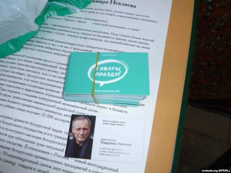 Без агітацыйных матэрыялаў праводзяць свае пікеты паплечнікі Някляева. Яны раздаюць толькі друкаваныя запрашэньні на сустрэчу 25-га лістапада, паведаміў супрацоўнік штабу кандыдата Сяргей Лапуцін: