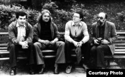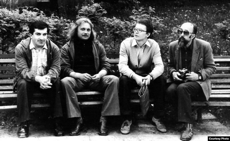Сустрэча пасьля абароны дысэртацыі ў Вільні. 1985 год. Эдвард, Сяржук Сокалаў-Воюш, Вінцук Вячорка, Лявон Луцкевіч.