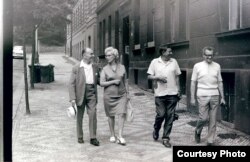 Уладзімер Караткевіч у Празе. Зьлева – Міхась Забэйда-Суміцкі, жонка пісьменьніка Валянціна, справа – Вацлаў Жыдліцкі. 1960-я гады. Фота. С. Панізьніка.