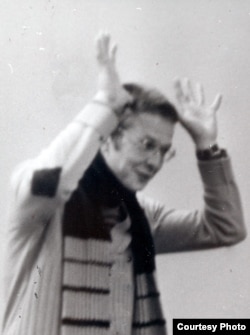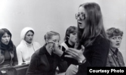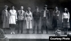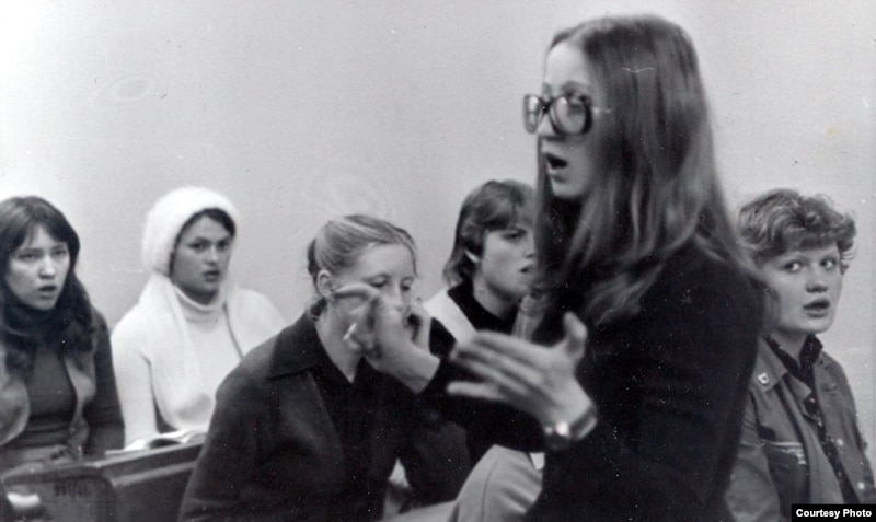 Ларыса Сімаковіч развучвае з майстроўцамі калядныя песьні. Зіма 1981-82 году, філфак БДУ.