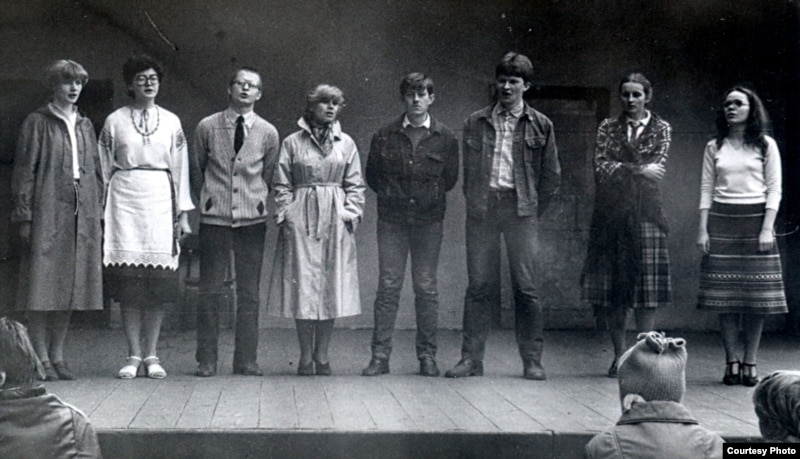 Выступ майстроўцаў на "агітпляцоўцы" ў менскім двары, 8 траўня 1983 году. Вінцук трэці зьлева.