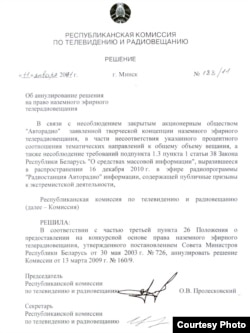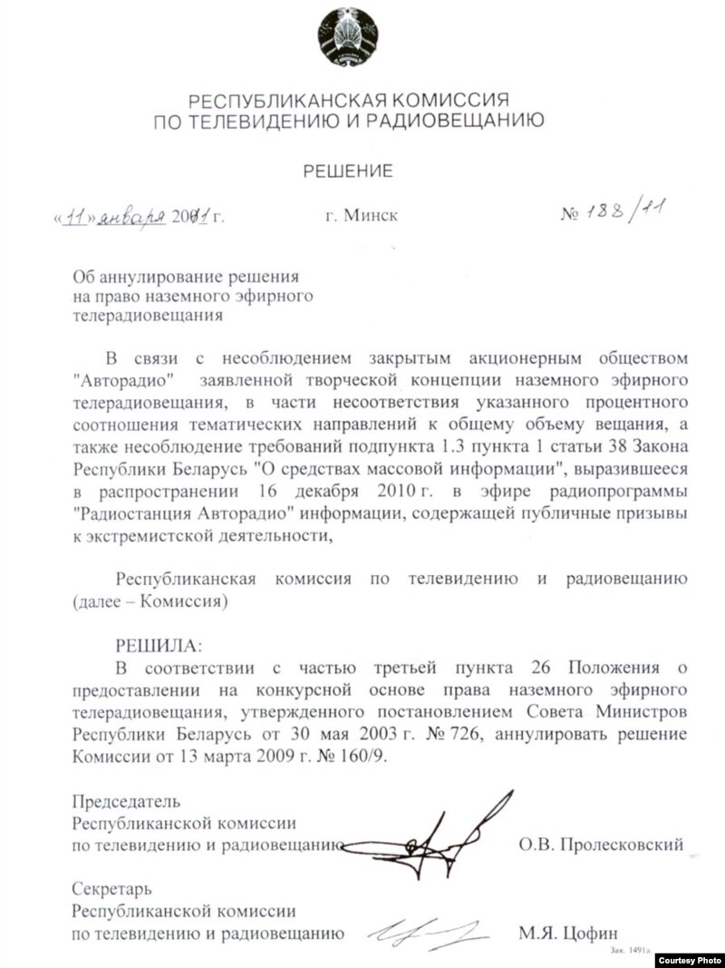У лісьце за подпісам кіраўніка камісіі Алега Праляскоўскага адзначаецца, што закрыцьцё папулярнай станцыі зьвязанае зь «невыкананьнем заяўленай творчай канцэпцыі», а таксама з распаўсюдам напярэдадні прэзыдэнцкіх выбараў інфармацыі, «якая зьмяшчае публічныя заклікі да экстрэмісцкай дзейнасьці».