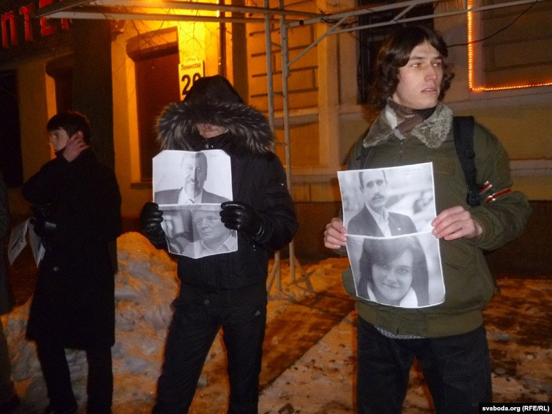 Яўген Васьковіч (крайні справа, з партрэтамі Севярынца й Палажанкі) удзельнічае ў акцыі салідарнасьці 16 студзеня 2011 году.