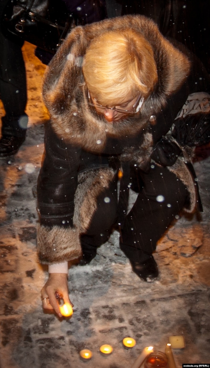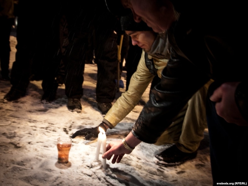 Днём у Палацы рэспублікі адбылася чарговая інаўгурацыя Аляксандра Лукашэнкі, а ў восем гадзінаў вечара на Кастрычніцкай плошчы ў Менску пачалася акцыя салідарнасьці з палітзьняволенымі. Яе ўдзельнікі моўчкі падыходзілі на плошчу па адным, па двое, запальвалі зьнічы і ставілі іх у цэнтры плошчы. Запаленыя зьнічы — напамін пра падзеі, якія адбыліся 19 сьнежня, калі тысячы людзей былі зьбітыя за тое, што пратэставалі супраць фальсыфікацыі выбараў. І гэта знак салідарнасьці са зьняволенымі. Актывіст Макс Вінярскі прынёс з сабой Канстытуцыю Беларусі: