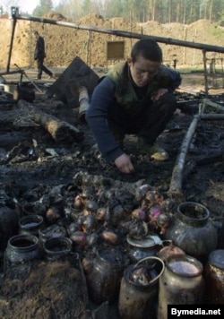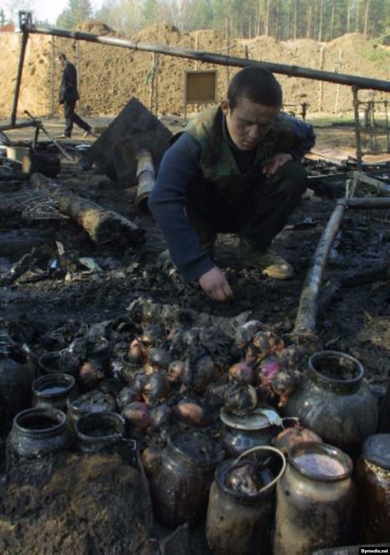 19 красавіка 2002 году. Васіль Парфянкоў ля згарэлага намёту