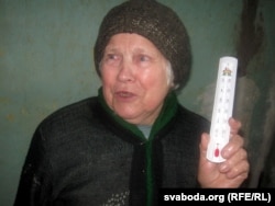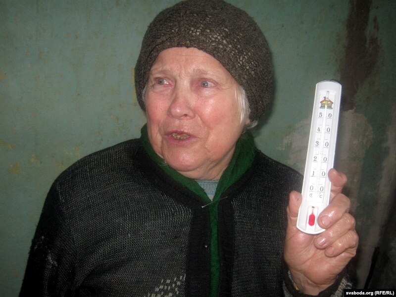 Дзьверы нам адчынілі толькі на другім паверсе. Спадарыня Сідоранка жыве тут чацьвёрты год. Падраныя, прамоклыя сьцены, на тэрмомэтры ўсяго 13 градусаў. 76-гадовая бабуля, захінутая ў хусткі, заломвае рукі.