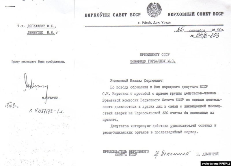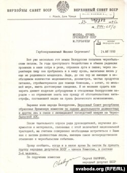 Думаю, Гарбачоў прачытаў толькі тое, што падкрэсьліў у лісьце невядомы мне ягоны рэфэрэнт: “Вярхоўны Савет рэспублікі ўтварыў Часовую камісію па ацэнцы дзейнасьці службовых і іншых асобаў у сувязі зь ліквідацыяй наступстваў аварыі на Чарнобыльскай АЭС… калі і ў які час Вы маглі б прыняць групу народных дэпутатаў БССР – членаў Камісіі, у складзе 3-4 чалавек?”