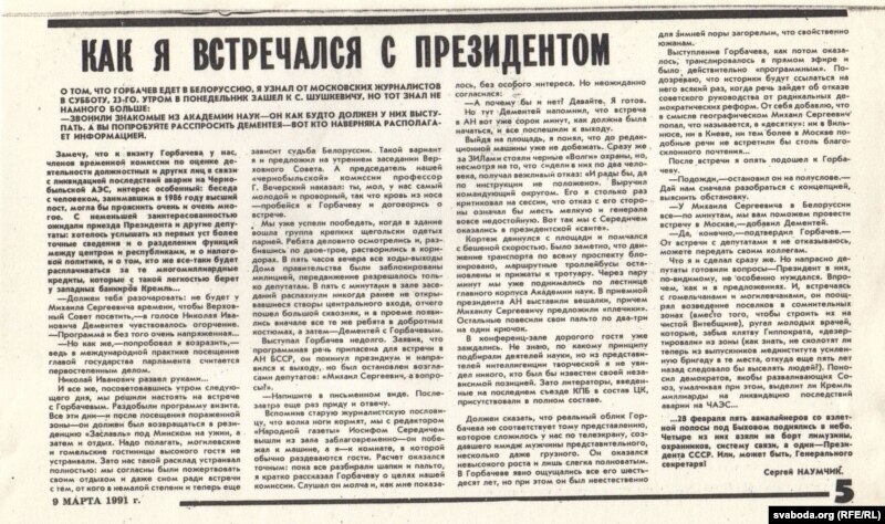Заўважу, што да візыту Гарбачова ў нас, членаў Часовай камісіі па ацэнцы дзеяньняў службовых і іншых асобаў у сувязі зь ліквідацыяй наступстваў аварыі на Чарнобыльскай АЭС, цікавасьць асаблівая: гутарка з чалавекам, які займаў у 1986 годзе найвышэйшую пасаду, магла б высьветліць вельмі і вельмі шмат. Зь няменшым зацікаўленьнем чакалі прыезду Прэзыдэнта і іншыя дэпутаты: хацелася пачуць з першых вуснаў больш дакладныя зьвесткі і пра падзел функцыяў паміж цэнтрам і рэспублікамі, і пра падатковую палітыку, і пра тое, хто ўсё ж такі будзе расплочвацца за тыя шматмільярдныя крэдыты, якія з такой лёгкасьцю бярэ ў заходніх банкіраў Крэмль…”