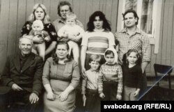 Сяргей і Тамара Антончык зь дзецьмі (стаяць справа), сям’ёй брата Сяргея і бацькамі (сядзяць). 1985 год.