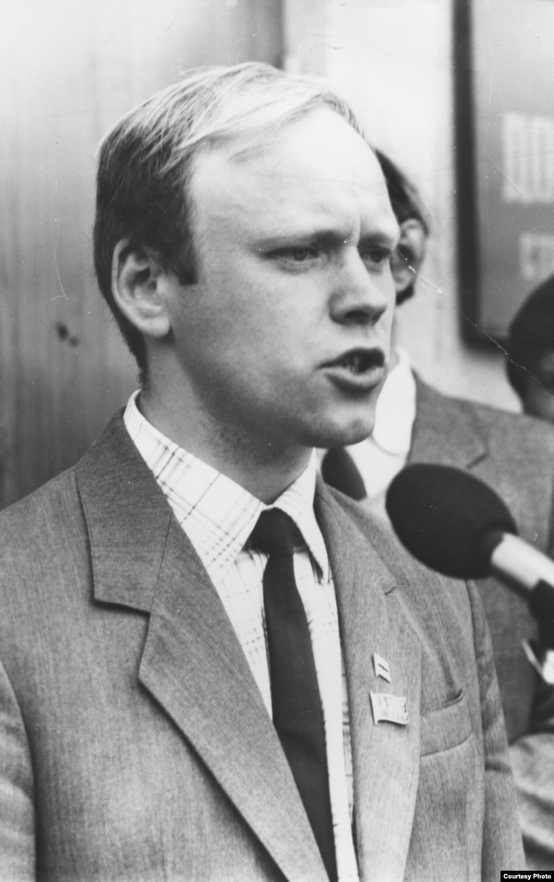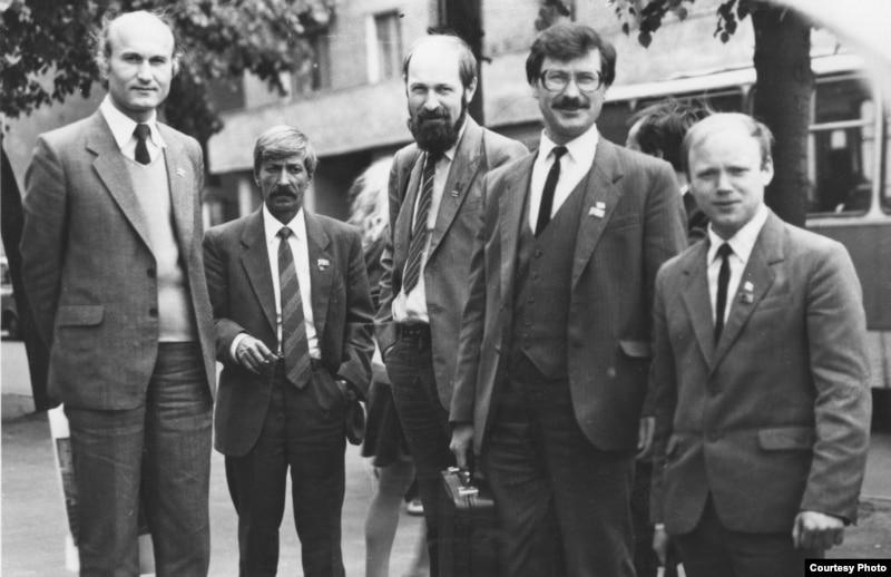 Парлямэнцкая апазыцыя БНФ. Паездка ў Магілёў. 1990. Зьлева направа — Зянон Пазьняк, Барыс Гюнтэр, Алег Трусаў, Валянцін Голубеў, Юры Беленькі