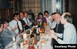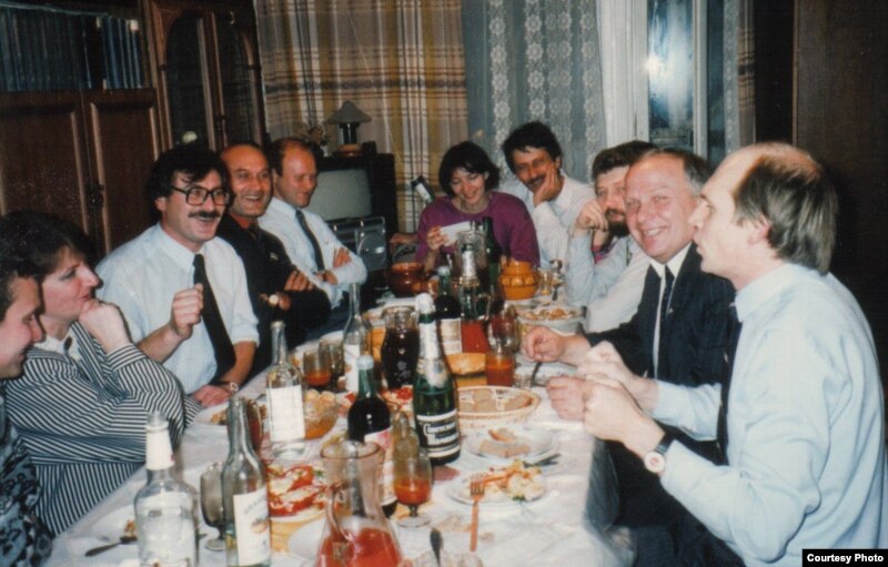 Дэпутаты Апазыцыі БНФ на вясельлі Лявонція Зданевіча. Зьлева направа: Сяргей Антончык, Ірына Голубева, Валянцін Голубеў, Зянон Пазьняк, Юрась Беленькі, маладажоны Зданевічы, Сяргей Навумчык, Уладзімер Заблоцкі, Лявон Баршчэўскі. 1992. З архіву С.Навумчыка.