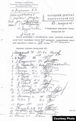 Пакет дакумэнтаў, падрыхтаваных Апазыцыяй БНФ для аднаўленьня незалежнасьці Беларусі. 23 жніўня 1991 г.Подпіс Ю.Беленькага — № 20. З архіву С. Навумчыка.