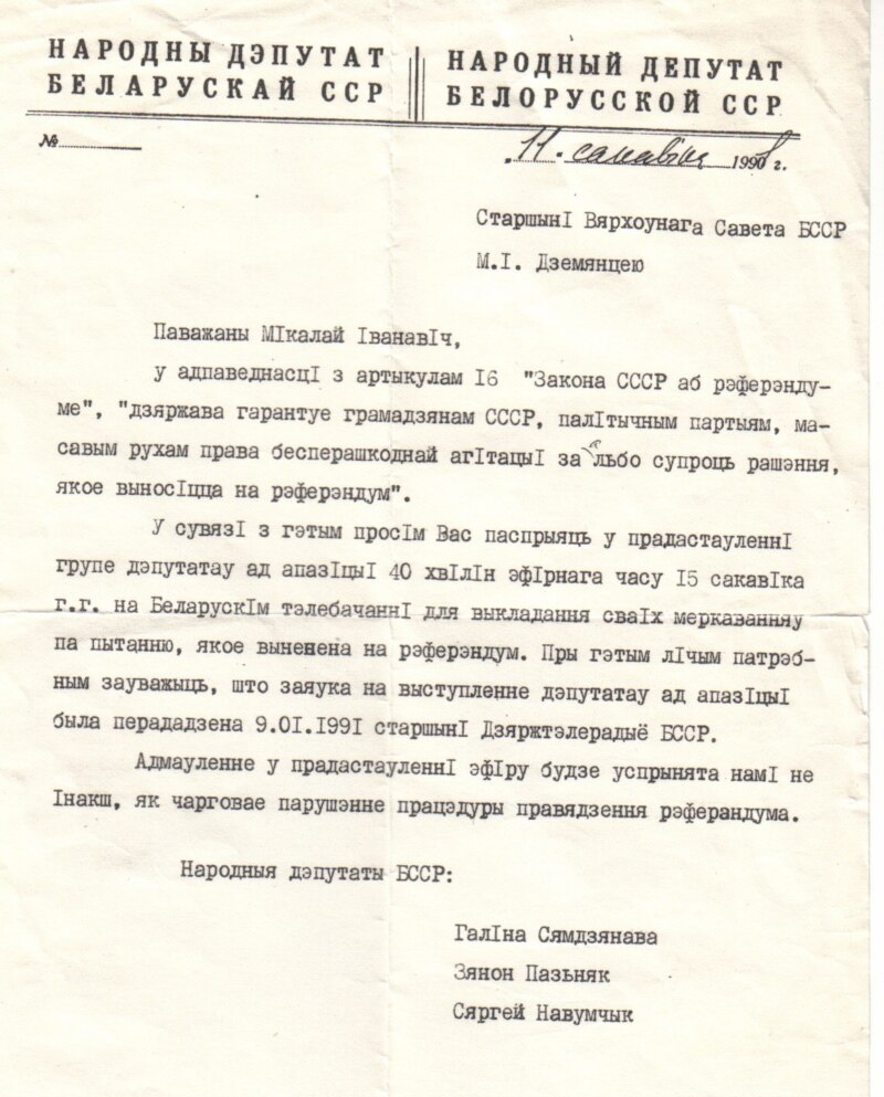Вычарпаўшы ўсе магчымасьці, 11 сакавіка дэпутаты Галіна Сямдзянава, Зянон Пазьняк і аўтар гэтых радкоў зьвярнуліся да фармальнага кіраўніка дзяржавы, да Дземянцея, “з просьбай паспрыяць ў прадастаўленьні групе дэпутатаў ад апазыцыі 40 хвілін эфірнага часу 15 сакавіка г.г. на Беларускім тэлебачаньні для выкладаньня сваіх меркаваньняў па пытаньню, якое вынесенае на рэфэрэндум... Адмаўленьне ў прадастаўленьні эфіру будзе ўспрынята намі не інакш, як чарговае парушэньне працэдуры рэфэрэндуму.”