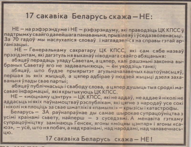 “Углядзіцеся ў здымкі, зробленыя ў сталіцы напярэдадні і ў дзень правядзеньня Усесаюзнага рэфэрэндуму аб захаваньні нашага Саюза. Тры першыя зь іх зьнятыя га мітынгу БНФ, дзе было выліта нямала бруду на нашу гісторыю, на нашу краіну..." (Тут ізноў прыпыню цытаваньне. Ня памятаю, каб калі-небудзь хто-небудзь на мітынгах БНФ казаў нешта дрэннае пра пераможцаў бітвы пад Воршай, паўстанцаў Каліноўскага ці заснавальнікаў “Нашай Нівы”, пляжыў ВКЛ ці БНР. Але казалі пра беларуска-расейскую вайну 17 стагодзьдзя, калі войскі цара Аляксея Міхайлавіча зьнішчылі палову беларусаў, пра Курапаты, пра ГУЛаг, пра кінутых “саюзным цэнтрам” у бядзе жыхароў чарнобыльскіх раёнаў).