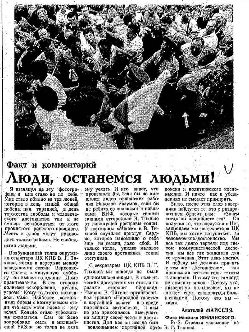 Некаторыя дэпутаты БНФ казалі мне, што выпадак зь Ціхінем быў прыкметным і нават у нечым сымбалічным эпізодам тых жнівеньскіх дзён — народ на плошчы выказаў сваё стаўленьне да аднаго з кіраўнікоў кампартыі, якая заяўляла пра сваю еднасьць з народам. З другога боку, актывісты Народнага Фронту паказалі, што яны прыхільнікі цывілізаваных спосабаў палітычнай барацьбы.