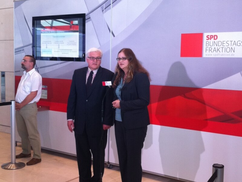 Перад выступам адбылася сумесная прэс-канфэрэнцыя з Франк-Вальнэрам Штайнмаерам, былым міністрам замежных спраў Нямеччыны. Цяпер ён зьяўляецца старшынём фракцыі СПД у Бундэстагу. Тэма канфэрэнцыі і дакладу прысьвечаная суду над Мікалаем Статкевічам, які пачнецца 11 траўня.
