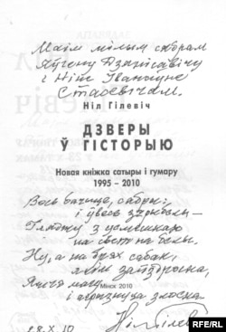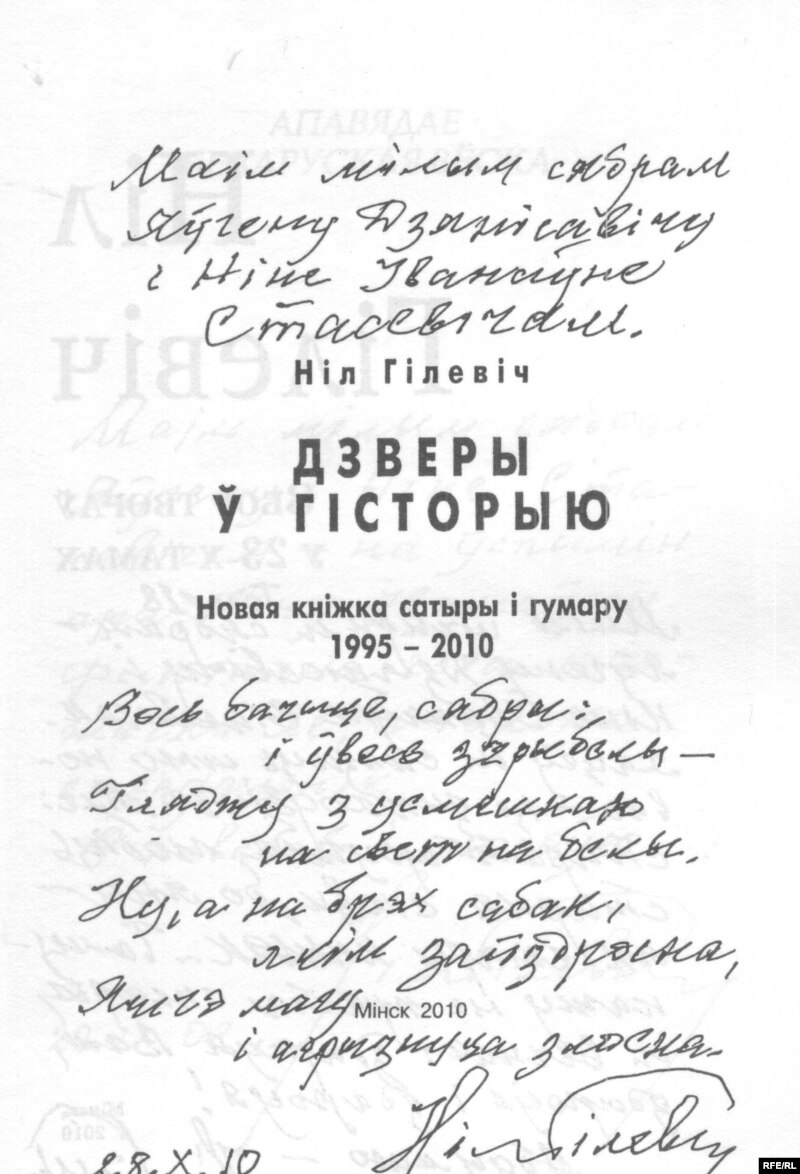 Характэрнай асаблівасьцю Ніла Гілевіча зьяўляецца тое, што ён вельмі сур’ёзна ставіцца да аўтографаў на кнігах. Вось паглядзіце, што ён напісаў мне на кнізе „Родныя дзеці“: „Яўгену Дзянісавічу і Ніне Іванаўне Стасевічам. Прыміце, сябры дарагія, / Эпічную споведзь маю, / Ёсьць мова — народ не загіне, / На гэтым стаяў і стаю. / І праўды вышэйшай, чым гэта, / Няма на зямлі для паэта“. А вось аўтограф на кніжцы сатыры і гумару „Дзьверы ў гісторыю“: „Вось бачыце, сябры, і ўвесь згрыбелы / Гляджу з усьмешкаю на сьвет на белы. / Ну а на брэх сабак, якім зайздросна, / Яшчэ магу і агрызнуцца злосна“. Як бачыце, Ніл Гілевіч — майстар аўтографаў. Кожны з ягоных аўтографаў — гэта міні-твор, закончаная думка. І ў творы гэтым — адносіны паэта ня толькі да мяне, але і да тых, хто яму ў жыцьці замінае, зрабіў нешта дрэннае».
