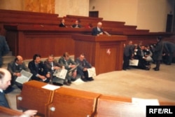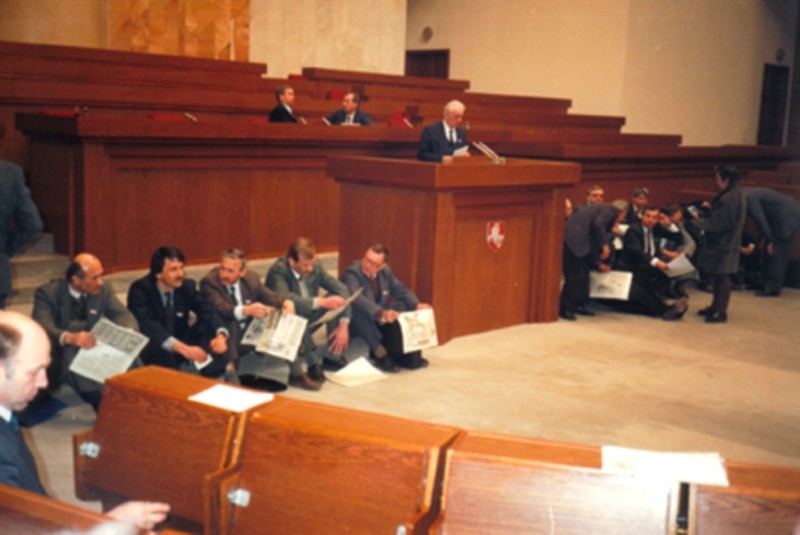 Галадоўка дэпутатаў Апазыцыі БНФ у Авальнай залі. 11 красавіка 1995. Ігар Гермянчук -- чацьвёрты зьлева.