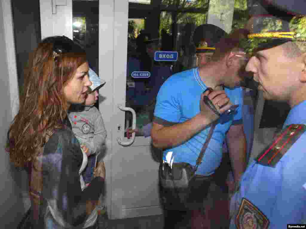 Жонку журналіста Аксану Пачобут з дзіцём на руках ў тамбуре суду не пускае ўнутр міліцыянт