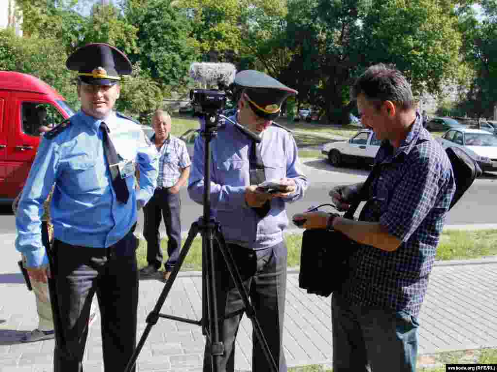 Міліцыянты правяраюць дакумэнты ў журналістаў