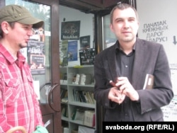Лявон Вольскі і Альгерд Бахарэвіч на ганку кнігарні "логвінаЎ"