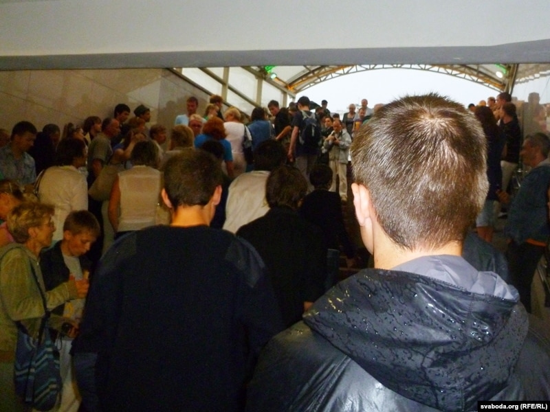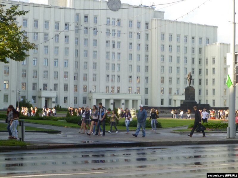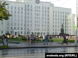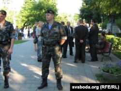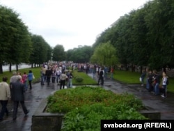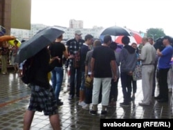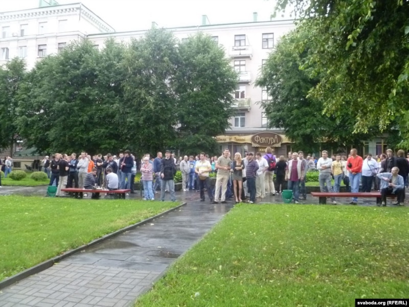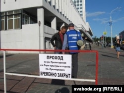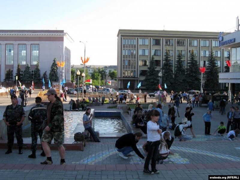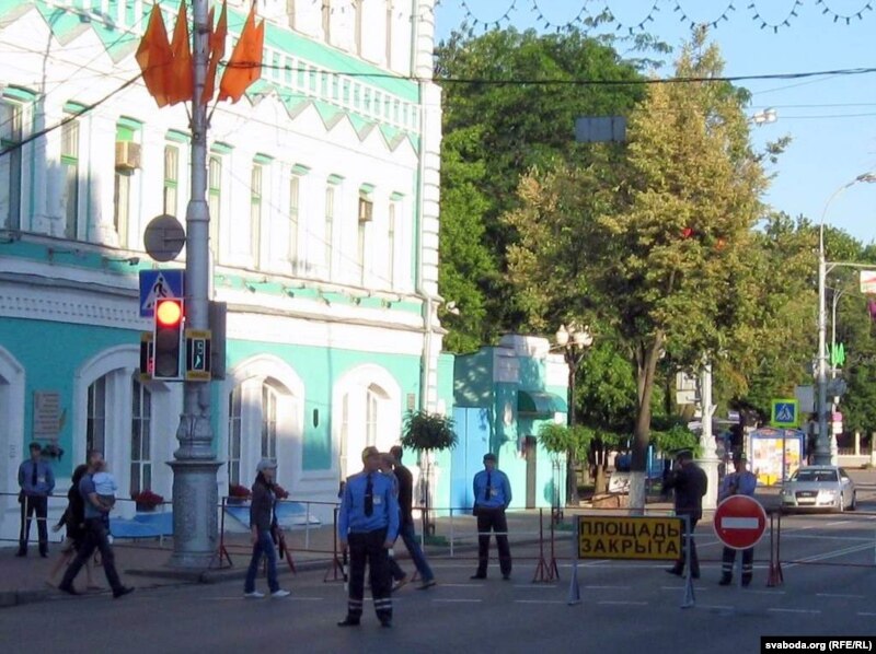 Другая вялікая група людзей стаяла на краі плошчы Перамогі каля адзінага тут жылога дзевяціпавярховіка з крамамі ўнізе. Тут жа стаяла міліцэйскае і гарадзкое начальства, некалькі дзясяткаў людзей у цывільным з рацыямі. Мокнуць на дажджы давялося толькі спэцназаўцам, якія ахоўвалі пустую плошчу.