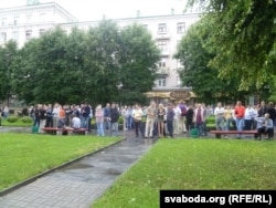 Сквэр насупраць плошчы. Зьбіраюцца ўдзельнікі маўклівай акцыі пратэсту.