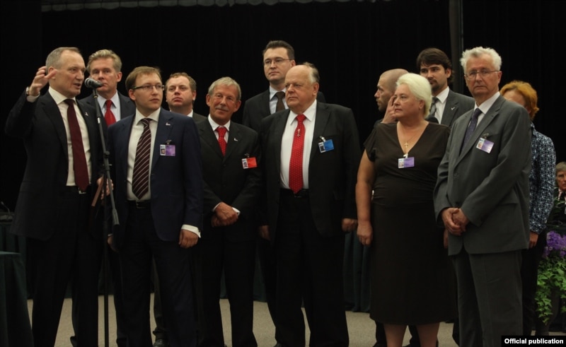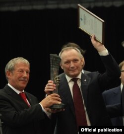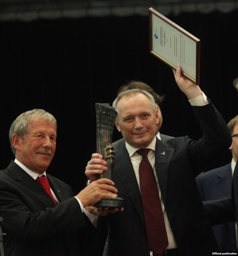 Міністр замежных спраў Літвы Аўдроніс Ажубаліс перадаў прэмію Уладзімеру Някляеву.