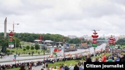 Удзельнікі сьвяткаваньня Дня вызваленьня і Дня незалежнасьці пачалі пакідаць месца падзеі адначасна з заканчэньнем вайсковага параду, не чакаючы, каб пачалося спартовае сьвята.
