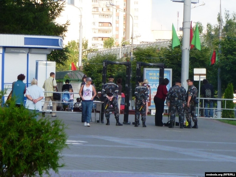 Супрацоўнікі міліцыі сур’ёзна рыхтаваліся да таго, што народу зьбярэцца нашмат больш: яшчэ ў 18:30 плошчу Перамогі абгарадзілі па пэрымэтры жалезнымі загарадкамі, а з чатырох бакоў усталявалі турнікеты з мэталашукальнікамі.