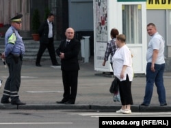 19:10 Супрацоўнікі ў цывільным забараняюць людзям стаяць каля уваходу на станцыю мэтро «Кастрычніцкая» і унівэрсаму «Цэнтральны».