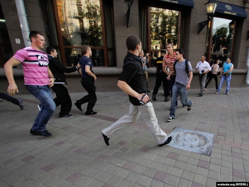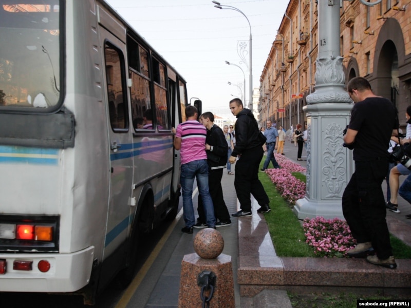 19:30 На падыходах да ГУМу перад паваротам людзі ў цывільным перагарадзілі дарогу ўдзельнікам акцыі, пераважна маладым людзям, якія пляскаюць у далоні. Аўтамабілі сыгналяць таксама. Удзельнікі акцыі скандуюць «Перамен!» Пад’яжджае аўтобус без нумарных знакаў. Удзельнікі пачалі разьбягацца. Схапілі каля 10 чалавек.
