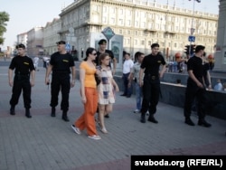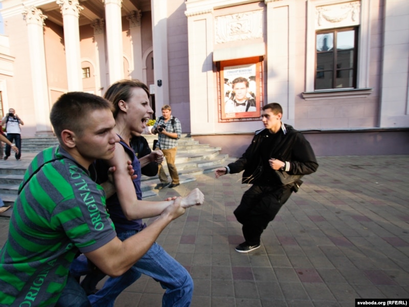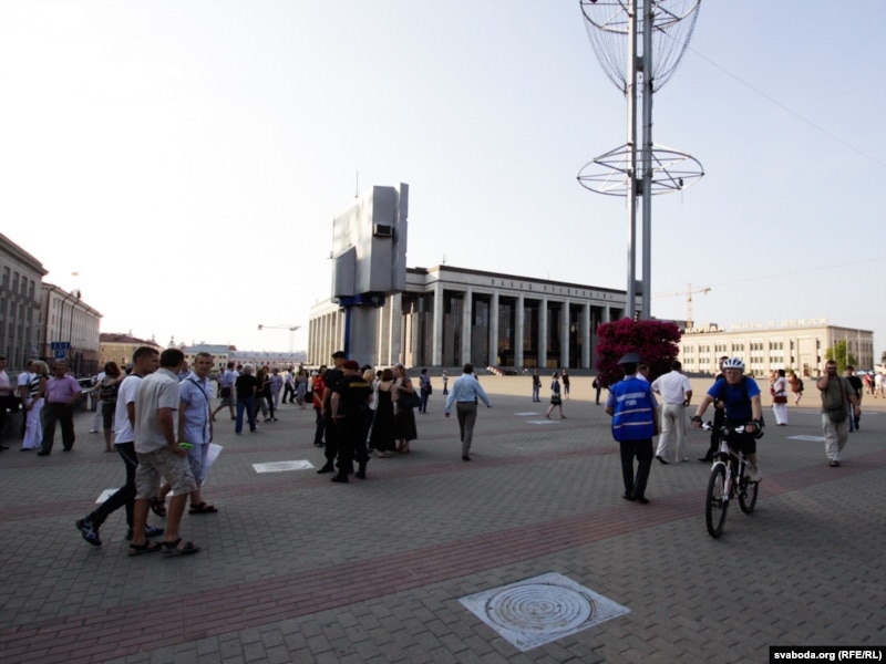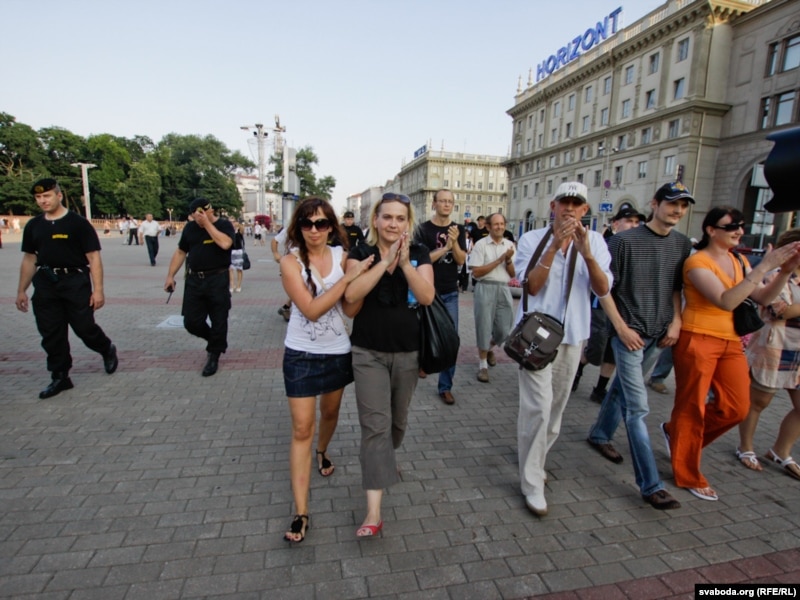 19:20 Каля 30 спэцназаўцаў у чорным вылецелі на плошчу, і пачалі выцясьняць людзей. Спэцназаўцы зрабілі ланцуг, які выцясьняе прысутных з Кастрычніцкай плошчы. Некалькі дзясяткаў людзей пачалі пляскаць у далоні. Адна з удзельніц акцыі кажа, што яна гэта робіць, каб адчуваць падтрымку людзей. Выцясьняюць нават тых, хто сядзіць на лаўках па вуліцы Энгельса. Але нікога не затрымліваюць. Людзі не далі затрымаць таго, хто даваў інтэрвію.