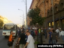 18:45 Людзі пачынаюць зьбірацца ў раёне Макдональдса і ўнівэрсама «Цэнтральны». Людзей тут нашмат болей, чым на іншым боку праспэкту. Апэратары ў цывільным здымаюць на відэа.