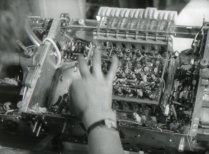 Жыцьцё вяртаецца ў тэкст, калі ён спыняецца на хвіліну ў цэху, дзе працуюць прэсы: