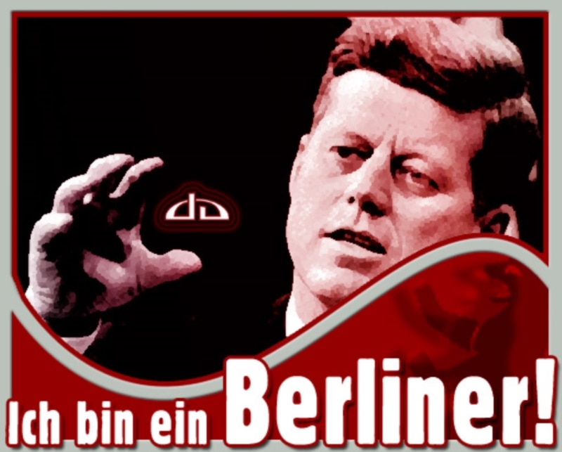 **Цалкам гэтыя словы салідарнасьці, зь якімі Кенэдзі зьвярнуўся да жыхароў Бэрліну за чатыры месяцы да забойства, гучаць так: “Дзьве тысячы гадоў таму найвышэйшым гонарам былі словы civis Romanus sum (я – рымскі грамадзянін). У свабодным сьвеце сёньня словамі найвышэйшага гонару зьяўляюцца “Я – бэрлінец!”
