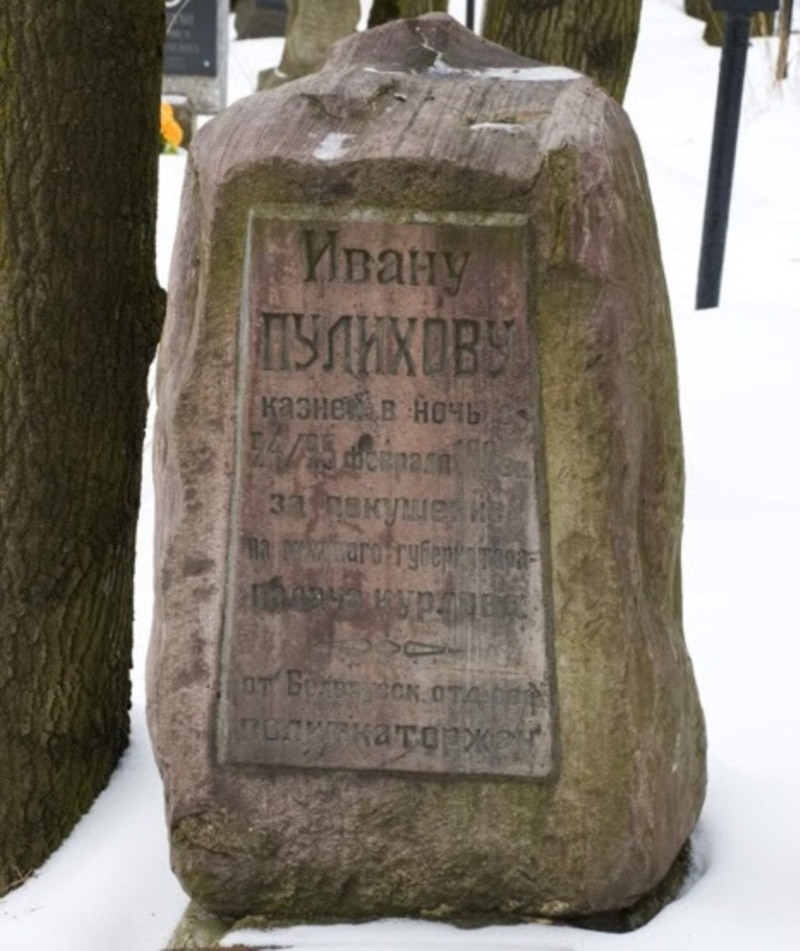 “Пахавалі Пуліхава таемна, як і сёньня гэта робяць са сьмяротнікамі. Пра месца пахаваньня ведаў толькі вартаўнік Старажоўскіх могілак. Праз 20 гадоў, у 1926-м, вартаўніка адшукалі колішнія паліткатаржане, якія прыехалі ў Менск у сувязі з гадавінай тых падзеяў. Празь некаторы час былыя палітвязьні ўзьвялі на Старажоўскіх могілках помнік са словамі смутку на магільным камені. Пазьней, у 1954-м, рэшткі рэвалюцыянэра ды камень перанесьлі на Вайсковыя могілкі, што цяпер на вуліцы Казлова. У традыцыях гарадзкога фальклёру нехта напісаў песьню.