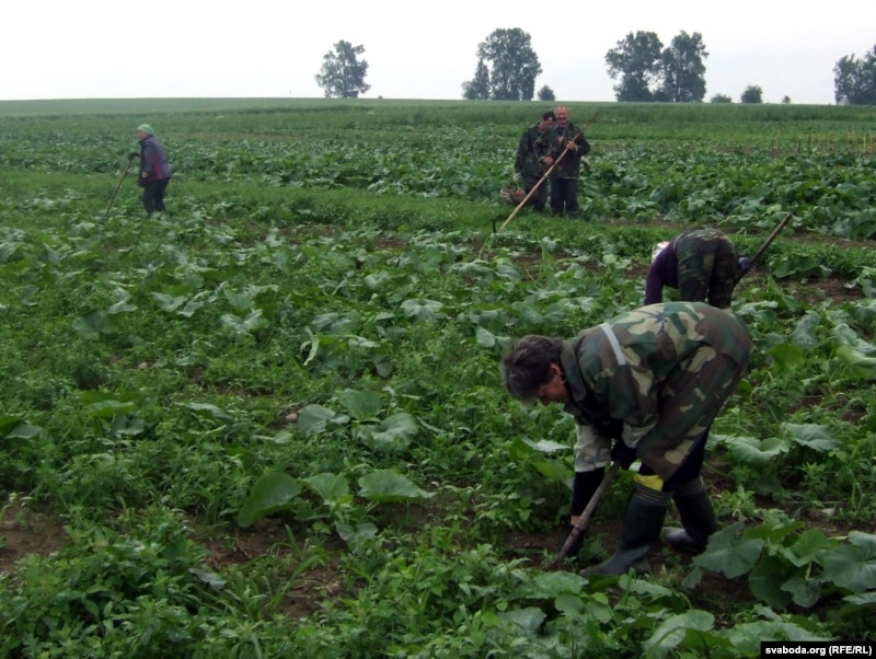 Дзяўчаты: «Аклад 480 тысяч, калі выходзім 26 дзён на працу. Мы працуем з 8 раніцы да гадзіны, пасьля з 3 да 7. Могуць паслаць на зернясховішча, дзе можам цягаць мяхі. Мех важыць, да прыкладу, 100 кг, а я — 45. І я павінна палову машыны разгрузіць „патраўленага“ гароху, які пасьля рассыпаюць на палеткі. Пры гэтым марлевых павязак альбо малака, якія павінны даваць, ніхто не дае. Запісваецца ўсё, як „палачкі“ ў 50-я гады — ідзе пагадзінная аплата. А пасьля за падвячоркі вылічваюць — Сьвета ня выйшла ў мінулым месяцы 26 дзён, і ў мінулым месяцы вылічылі 155 рублёў. А падвячоркі — кусок кілбасы і кавалак хлеба. І ведаеце, у нас неяк быў Дзень калгасьніка, падышла Калішыха, намесьніца старшыні па ідэалёгіі, сказала нападпітку, што „дзякуй вам, паляводам, што вы працуеце на нас“, — мы як рабы працуем на іх!».