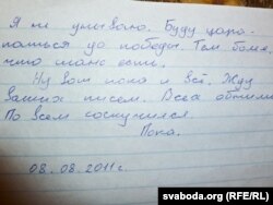 «Прывітаньне, мама! Рады, што ў вас усё нармальна. У мяне па-ранейшаму ўсё добра. Са здароўем таксама ўсё добра. Ні ў чым ня маю патрэбы. Усё ў мяне ёсьць. Я не маркочуся, буду драпацца да перамогі. Тым больш што шанец маю».