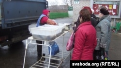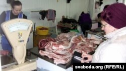 Сьвятлана: «Дорага — 55 тысячаў мяса, 50 сала — хатняя закупка ў насельніцтва. Бяруць вельмі слаба — дорага, дорага! А таньней ня можам — гаспадары ня хочуць ніжэй даваць. Раней прадавалі ў дзень 10-12 галоў сьвіней, а цяпер мо палова тушы за дзень — во, бачыце, з раніцы ўсё ляжыць…»